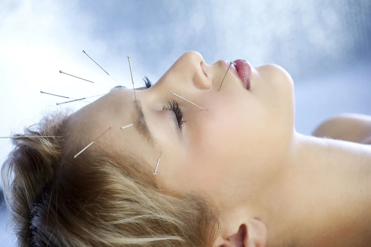 Closeup of beautiful young woman with Acupuncture Needles during healing treatment, selective focus on eye and near needle